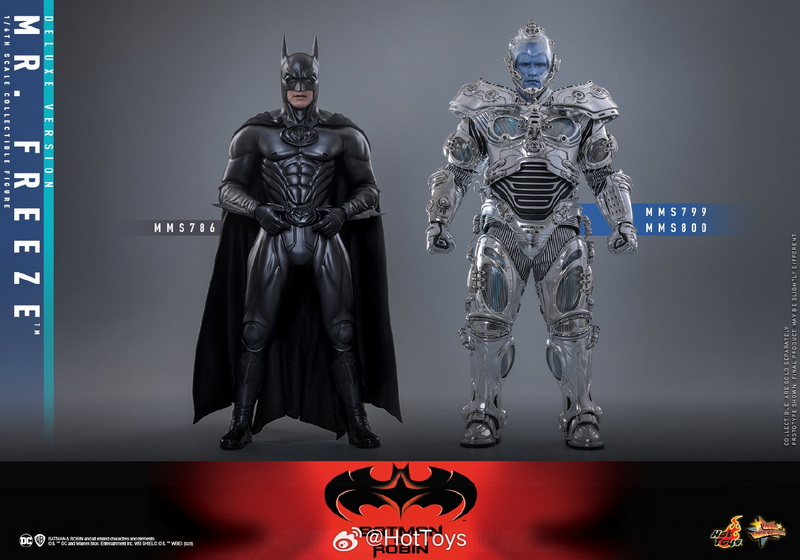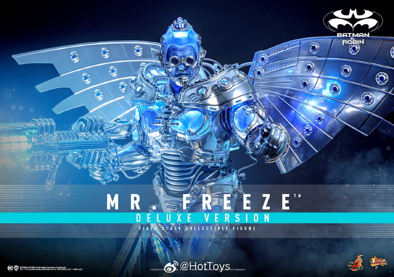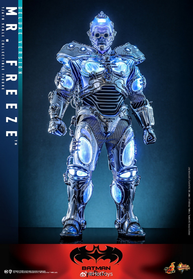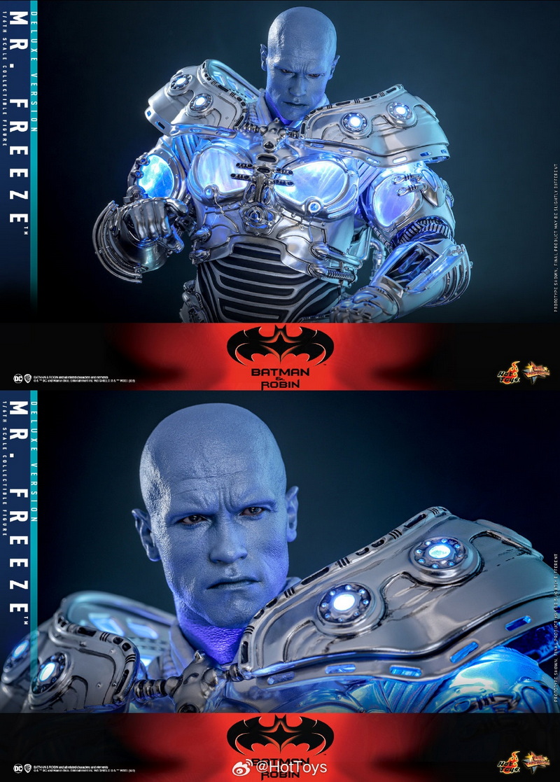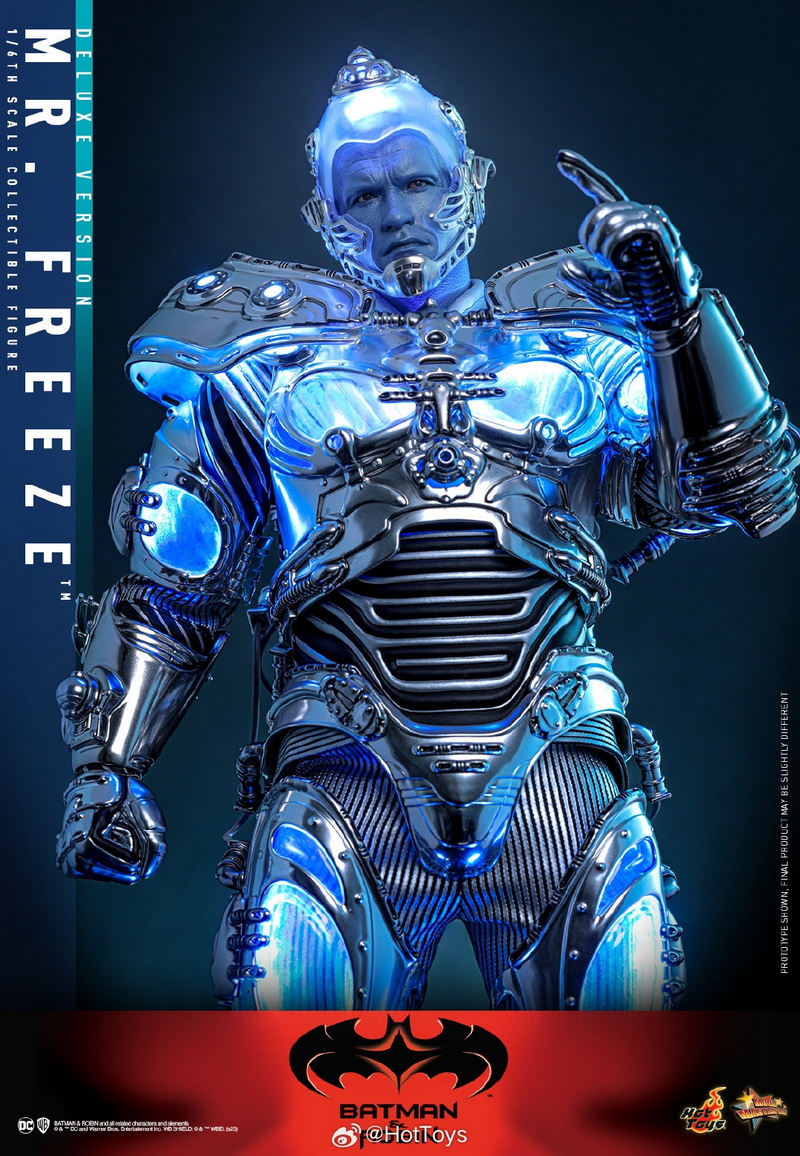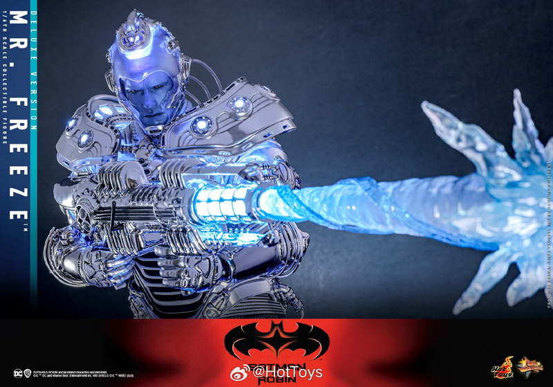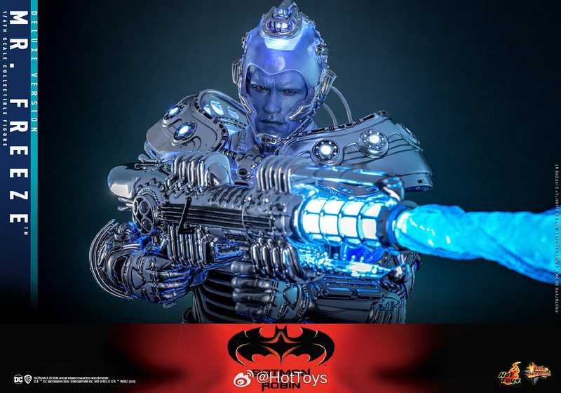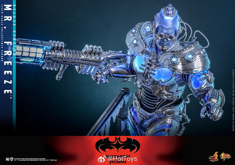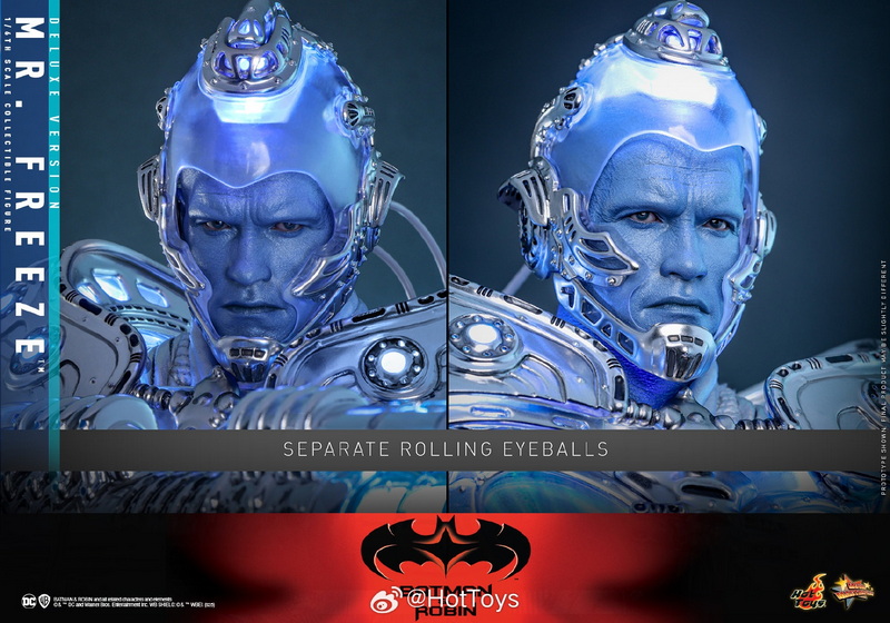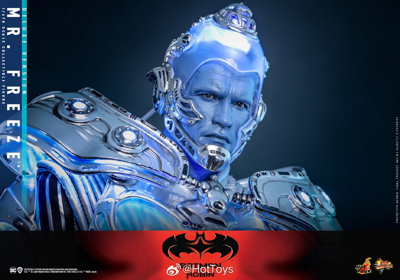 – The 1:6 scale Mr. Freeze collectible figure is approximately 33.5cm tall, featuring 30 points of articulation and multiple interchangeable hands, allowing for the recreation of various action poses from the movie. In the design of the head sculpt, the Hot Toys team meticulously captured the facial contours of Hollywood superstar Arnold Schwarzenegger and the icy blue skin and stern expression of the Mr. Freeze character he portrayed, paired with a transparent light-up helmet and specially made goggles, to interpret Mr. Freeze’s cold and ruthless temperament.